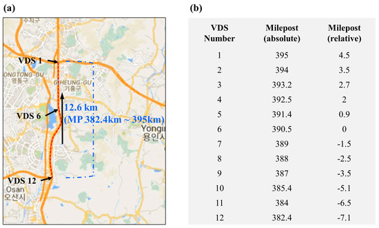 The Gyeongbu Expressway in South Korea was taken as the study site. Our study section was approximately 12.6 km in length in the vicinity of the Greater Seoul Area (GSA), with 12 vehicle detection systems (VDSs). The geographical information, the number of VDSs, and the absolute and relative milepost (unit is km) are shown in Figure 2. Traffic speed-data were collected from the Korea Expressway Corporation. The speed-data of each VDS was collected at the 5-min aggregate level. The observation period was between 1 March 2016 and 31 August 2016. All data were from real-life operations and the total number of days used was 158 days.