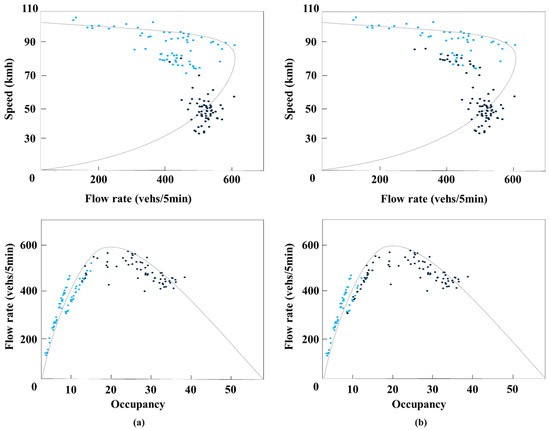 Flow-speed and occupancy-flow plots at VDS 4 on March 12 2016. (a) Classified by . (b) Classified by average speed.