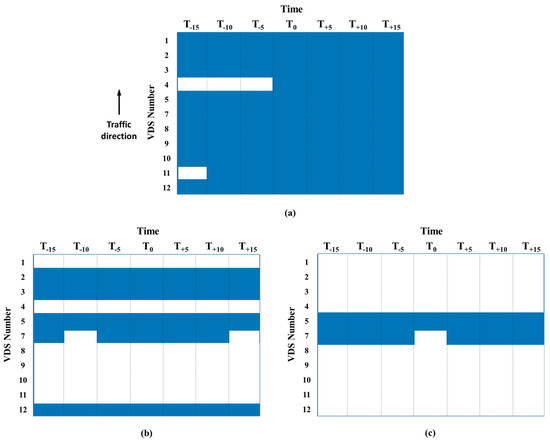 Spatiotemporal dependence among variables (a) Section-based traffic state (SBTS) I (b) SBTS II (c) SBTS III.
