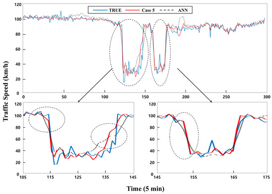 Figure 7 shows the real data and imputation results of the proposed model (Case 5) and other compared models for a particular weekday (20 July 2016). The proposed model was found to capture the precursor of transitions significantly faster. Unlike the proposed model, the two existing models with which the proposed model was compared with, tended to provide only the average value of free-flow and congestion when the transition started. This shows that it is promising to adopt the proposed approach of categorizing traffic data by each SBTS, using and selected variables that would improve the performance of missing value imputations.
