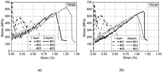 Axial tensile stress versus axial tensile strain curves of: (a) TRNM (Textile Reinforced Normal Weight Mortar) and (b) TRLM (Textile Reinforced Lightweight Mortar) coupons (stress is calculated by dividing with the load-aligned fibers’ cross section).