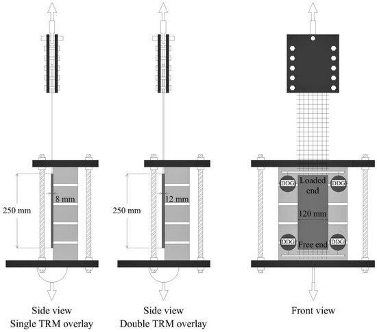 Shear bond test specimens were designed and constructed (for the most part), according to the recommendation of RILEM TC 250-CSM [19]. Each specimen comprised one wall prism (wallette) reinforced with a single-layer or double-layer TRM overlay on one side, which was cast according to the wet lay-up process (Figure 2). Each mortar layer (2 and 3 for single-layer and double-layer TRMs, respectively) was approximately 4 mm-thick and was toweled flush to the prescribed thickness by means of a 4 mm-thick rubber-cork frame. The TRM overlay (and, hence, the textile strip) was centrally bonded on the wallettes’ width-wise. The length and width of each TRM overlay were equal to 250 mm and 120 mm (7 yarns), respectively, while its distance from the wall’s top edge was equal to 40 mm so that stress concentration phenomena would be avoided. The textile(s) projected from both sides of the TRM overlay, that is from the top and bottom part of the overlay designated herein as “loaded end” and “free end”, respectively (Figure 2). Specimens were moist-cured for 7 days (covered with wet burlaps) and then stored in lab conditions (20 °C ± 2 °C, 65% RH) for 21 more days until pre-heating treatment, heating, and final testing. Prior to testing, the extremity/extremit(ies) of the projecting textile(s) from the loaded end of the TRM overlays were sandwiched between either two or three glued-on fiber-reinforced polymer (FRP) tabs depending on the number of textile layers (i.e., one or two, respectively).