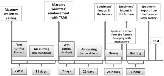 Prior to subjecting the specimens to the prescribed heating regime, all of them were inserted in an electrical oven at a constant temperature of 40 °C for 24 h with the aim of bringing them to a state of approximately equal moisture content. Upon removal from the oven and until their exposure to elevated temperatures, specimens were wrapped in a PVC membrane in order to prevent moisture exchange with the atmosphere. For heating to 120 °C and 200 °C, the electrical oven (the same used for the drying sequence) was preheated prior to specimens’ placement at a temperature higher than the target one in order to counterbalance the heat loss due to door opening. Each specimen rested in the oven for 1 h under the target temperature and remained undisturbed after turning the oven off until its temperature reached the ambient one. All heated specimens were tested upon completion of the heating-cooling regime. Figure 3 presents the time history of the specimens’ preparation and treatment.