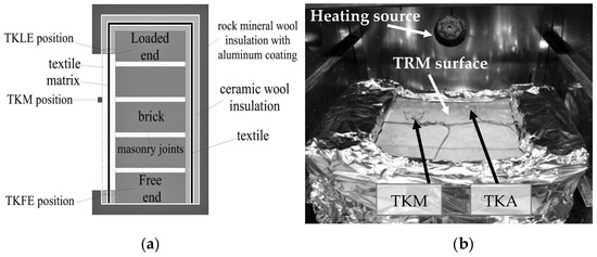 For specimens subjected to the previously described heating-cooling regime, the free part of the wallette surface furnished with the composite overlay had been covered with the same mortar used for the TRM so that real-life conditions were simulated during heating. For these specimens, the protection of the projecting bare textile was achieved using a combination of ceramic wool insulation and rock mineral wool insulation with aluminum coating, as depicted in Figure 4a. It is also noted that specimens were placed horizontally in the furnace so that heating coming from above was evenly distributed on the TRM strip, which faced upward (see Figure 4b). Four K-type thermocouples were used as heat sensors (Figure 4). One was placed at a close distance from the specimen’s surface in order to record the air temperature (TKA). The furnace temperature was adjusted so that the air temperature recorded by TKA was equal with the target one. The rest of the sensors (insulated against radiation heating) were applied on the specimen as follows: two of them were attached on the textile projecting from each end of the TRM strip [one close to the loaded end (TKLE) and another close to the free end (TKFE)] while another sensor was placed on the strip’s surface at a distance of 50 mm to 100 mm from the loaded end (TKM).