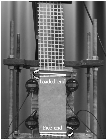 For the execution of the single-lap/single-prism shear bond tests, each wallette was fitted in a steel frame. Then, the textile(s) projecting from the loaded end was (were) connected to the fixed part of the machine through a joint that provided full in-plane and partial out-of-plane rotation capacity (Figure 2—Section 2.2). The connection was realized by clamping the FRP tab between two bolted hinged steel plates. During testing, the projecting textile(s) was (were) being pulled away from the bonded TRM overlay. Tests were carried out at a piston displacement-controlled mode using a servohydraulic testing machine (load capacity 250 kN). The displacement rate was set to 0.005 mm/s. Each specimen was instrumented (see Figure 2—Section 2.2) with: (i) two digital dial gauges (DDG) firmly attached on the wall close to the overlay’s loaded end acting against an aluminum plate glued on the first transversal yarn of the pulled textile in order to record the textile’s relative displacement in respect to the wallette (under the assumption that the TRM-to-substrate slip was null), (ii) two DDG glued on the wall close to the overlay’s free end acting against an aluminum plate glued on the second transversal yarn of the projecting textile in order to record the textile’s slip (these sensors were applied only on the Tx_Sy_z_01 specimen of each group of identical specimens).