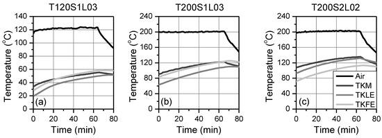 Thermocouples’ temperature profiles for representative specimens: (a) T120S1L03, (b) T200S1L03, and (c) T200S2L02.