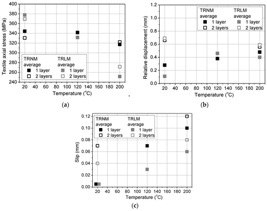 (a) Maximum textile axial stress, σmax, and corresponding (b) relative displacement, dr,max, and (c) slip, smax, versus nominal exposure temperature.