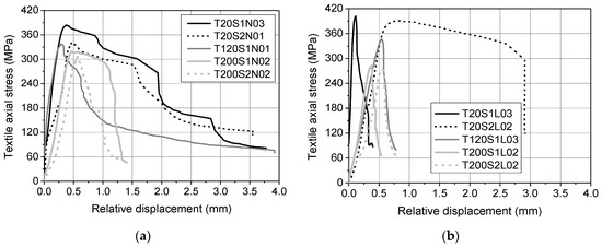 The response (textile axial stress versus relative displacement curves) of representative specimens of both TRM systems (TRNM and TRLM) is given in Figure 8. Most curves can be approximated as bilinear up to failure. In the first branch, both components (textile and mortar) behave in an elastic composite manner. The second branch extends between the change of the curve’s inclination and the maximum load where the bond between fiber yarns and matrix is gradually deteriorated along a part of the bond length. It is highlighted that failure manifests the commencement of the load-aligned yarns’ debonding from the matrix in combination with their sleeve fibers’ progressive rupture. Post-peak stress decrease is significantly more rapid for the TRLM overlays due to the brittleness of the lightweight mortar.