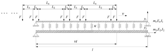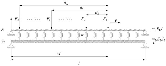 where is Dirac function; l is the length of a simply supported double-beam system; is the ith moving load. It is assumed that acts on at the initial moment (); , represents the distance from to .