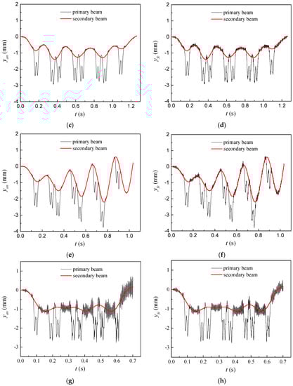The response of the beams obtained by different method: (a,b) ; (c,d) ; (e,f) ; (g,h) .