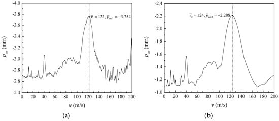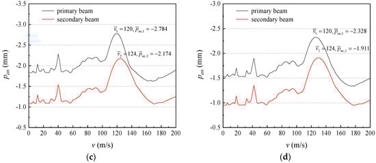 Figure 5 shows the relationship between the peak deflection of midspan and speed of loads for the simply supported double-beam system; and are the peak deflections of the midspan of the primary and secondary beams. As shown in Figure 5, the speed of the load-peak deflection of the midspan relationship curve of the primary and secondary beams clearly showed “abrupt increases”, indicating that the simply supported double-beam system had multiple critical speeds under successive moving loads. The peak deflection of the midspan of the primary beam reached its maximum value at , and the peak deflection of the midspan of the secondary beam reached its maximum value at . Assuming the speed corresponding to the maximum peak deflection of the midspan as the dividing speed, the dividing speeds of primary and secondary beams were and , respectively. In the speed of load-peak deflection of the midspan relationship curve of primary and secondary beams, the critical speeds corresponding to the “abrupt increases” were close to each other and should be avoided in engineering practice.