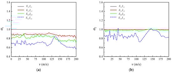 The effect of four flexural rigidity (EI) of the primary beam (i.e., , , , and ) on the peak deflection of the midspan of a simply supported double-beam system under successive moving loads was evaluated. The amplification factor of peak deflection of the midspan under different flexural rigidity is defined as follows: