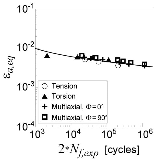 - Park, J.; Nelson, D. Evaluation of an energy-based approach and a critical plane approach for predicting constant amplitude multiaxial fatigue life. Int. J. Fatigue 2000, 22, 23–39. [Google Scholar] [CrossRef]