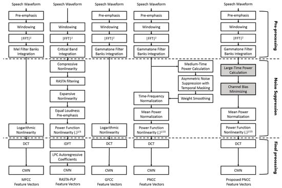 In this section, the modifications that were applied to the PNCC system will be explicated in detail. Figure 1 illustrates a comparison between the block diagram structures of the proposed PNCC method and state-of-the-art methods such as PNCC, GFCC, RASTA–PLP, and MFCC []. As shown in Figure 1, the block diagrams are divided into three stages. These stages are pre-processing, noise suppression, and final processing.