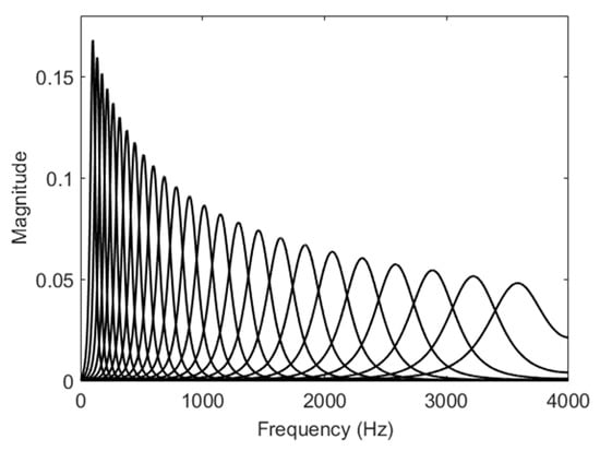 The gammatone filter banks provide more robust features rather than Mel-filter banks and bark filters for the MFCC and RASTA–PLP methods, respectively. Therefore, a set of 25 gammatone filters [,] were generated from the frequency response of the gammatone kernel basis functions from Equation (1) with center frequencies ranging from 100 Hz to 4 kHz, as shown in Figure 2.