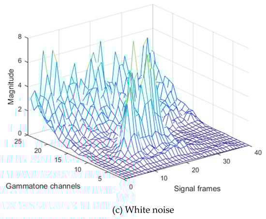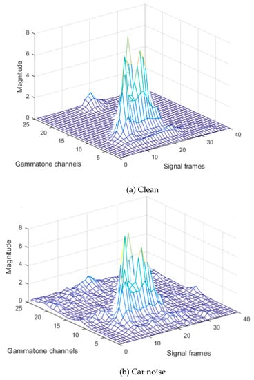 where represents the frame index, and is the gammatone channel index. As shown in Figure 3a, the power values of the gammatone spectrogram for clean speech does not change rapidly along with consequent frames. On the other hand, the power values of additive environmental and white noise change more frequently. Thus, these noises cause a sudden variation in speech values over consequent frames of each gammatone channel, as shown in Figure 3b,c. These sudden changes vary in each gammatone channel according to each type of 110 noise. Additionally, pre-emphasizing causes boosting of the additive noise values with speech at high frequency. Therefore, in this stage, the average filtering over each gammatone channel will cause smoothing of these sudden changes in the power values. Furthermore, the number of average window frames affects recognition performance. Using a large average window causes the 115 blur effect that can destroy the speech information, which degrades the system performance, especially in the case of undistorted speech utterances. Moreover, it is computationally demanding. On the other hand, small average window size leads to incomplete removal of sudden changes in power that are associated with some background noise conditions. Therefore, in this paper, the value of 120 coefficient is set to be equal to 5, and it was chosen experimentally by selecting the value that provides high performance at different noise levels.
