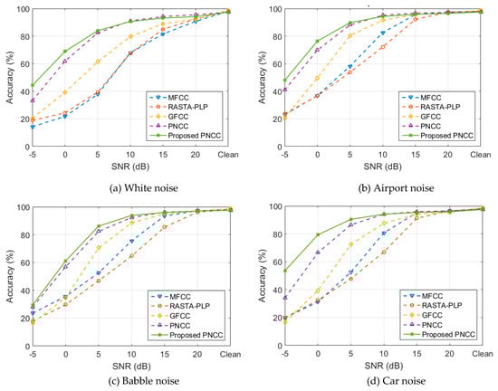 As seen in Figure 4, it was concluded that the lowest robustness against noise acquired for MFCC and RASTA–PLP systems was interchangeable. With some types of noise, the performance of MFCC was higher than RASTA–PLP, and the reverse was true for other circumstances, while in the rest of the cases, the performance varied for each noise level. Replacing the mel triangular filter banks in MFCC processing by the gammatone filter banks in the GFCC system provided significantly measurable improvements in the recognition accuracy for all types of degradation. However, with significant types of noise, the GFCC performance was less than both of these systems at a SNR of −5dB. Using the time–frequency noise suppression technique, mean power normalization, and power function nonlinearity using (1/15) root remarkably improved the recognition accuracy in the PNCC systems in comparison to the last three systems. The recognition accuracy of the enhanced proposed PNCC dramatically outperformed all the systems for all noise types, specifically at low SNRs, whereas at high SNR values, the recognition accuracy was almost unchanged.