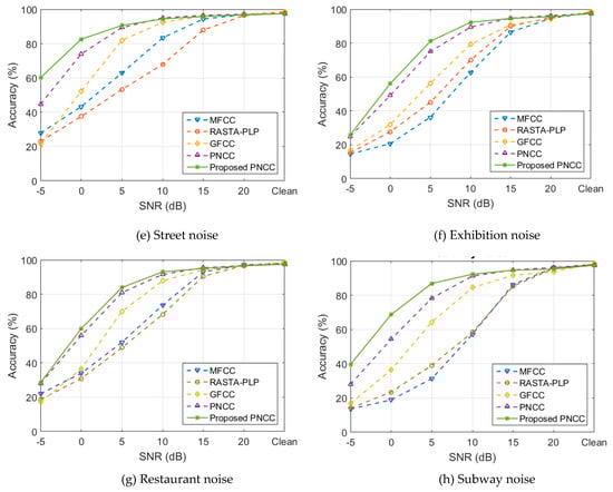 Figure 4 shows the recognition accuracy, which is presented graphically for the proposed PNCC method in comparison to the state-of-the-art PNCC system, as well as the most commonly used baseline systems, such as GFCC, MFCC, and RASTA–PLP. The first graphs are obtained accuracy in the case of AWGN, while the rest of the graphs are for different types of environmental noise. The performance of these systems for each noise is shown in the case of clean data and at six SNR levels from −5 dB to 20 dB with step size 5 dB.