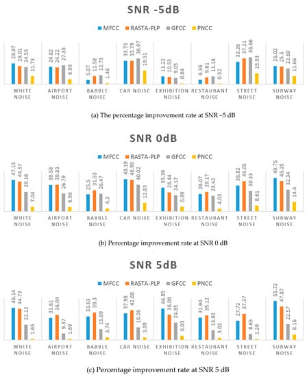 Moreover, the proposed robustness technique against the noise did not degrade the system performance in the case of the undistorted speech waveform. Thus, the blurring effect from the large-time power averaging filter was almost unnoticeable. Figure 5 demonstrates an in-depth analysis of the percentage improvement rate of the proposed method in comparison to the other methods at low SNRs, such as −5 dB, 0 dB, and 5 dB. Overall improvement in percentage recognition rate for all the types of noise was obtained in the case of MFCC, RASTA–PLP, and GFCC methods, and lastly PNCC method. In the SNR −5 dB bar chart, the highest recognition rate in comparison to RASTA–PLP and GFCC methods was determined in the street noise condition.