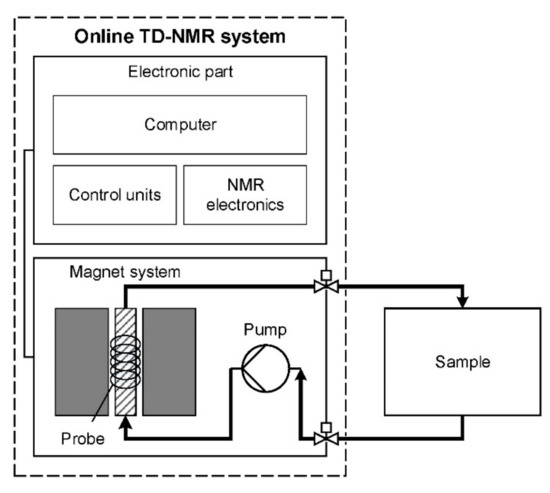 The online TD-NMR measuring system was developed based on a commercial TD-NMR analyzer as in Reference [23]. A schematic overview of the online TD-NMR system is given in Figure 1. It consists of an electronic part and an NdFeB magnet system with a probe and a pump. The 1H resonance frequency of the system was 26 MHz at 30 °C. The NMR probe was modified for the flowing samples using a Teflon tube with a 9 mm inner diameter. The electronic part included an NMR spectrometer, a compact computer, control units for the temperature of the magnet system, and temperature sensors. The sample temperature sensor was connected to the outer surface of the Teflon tube near to the NMR measuring volume.