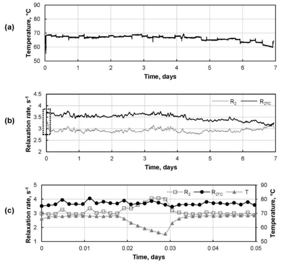 Data measured for the weak black liquor in the online test: (a) Sample temperature; (b) Measured R2 values and values of the R2TC corrected to Tref = 60 °C, after applying a one-hour moving average; (c) Temperature correction at the beginning of the test (dotted rectangle in Figure 4b): measured R2 (squares), values of the R2TC corrected to Tref = 60 °C (circles), and the sample temperature T (triangles).