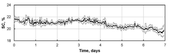 The temperatures and the NMR spin-spin relaxation rates of the weak black liquor were measured continuously using an online TD-NMR system in a pulp mill for seven days. The temperature correction in Equation (6) was applied to these data. The reference temperature Tref was 60 °C. A moving average was also used for these data sets to smooth out the short-term fluctuations. The curves are shown in Figure 4a,b, where we observed that T and R2 are changing, especially at the beginning and after the fourth day of the online test. A demonstration of the temperature correction at the beginning of the online test is given in Figure 4c. The deviation in the R2 value in Figure 4c was mainly caused by the temperature change. In Figure 4c, no moving average was used. Then, using the temperature-corrected R2TC values, the estimation of the SC was performed using Equation (7). A one-hour moving average was applied to the SC values, and the SD values were calculated within each hour using the moving data. The resulting SCs and SDs of the weak black liquor are given in Figure 5.