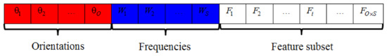 The key objective of the proposed texture classification method is to achieve satisfactory parameters and features of Gabor filter and create a reasonable mapping between the solution and HALO. The parameter optimization process needs bits to apply coding to the parameters, which are the orientations and frequencies W in Equations (9) and (10). The former O bits represent each orientation, the latter S is each scale, and the ranges of the parameters are, respectively, set to and with decimal coding. For feature selection, the length of coding is equal to the total number of features in the database, and here it is set to . For binary coding, every bit is expressed by the fixed value “0” or “1” by Equation (6), where “1” illustrates that the current feature will be chosen for classification, and “0” illustrates that the current feature will be abandoned. Thus, the total coding length of an ant is equal to . The encoding form of an ant for Gabor filter with O orientations and S scales is shown in Figure 1. The entire code simultaneously indicates the solution of the parameter settings and the feature subset of Gabor filter.