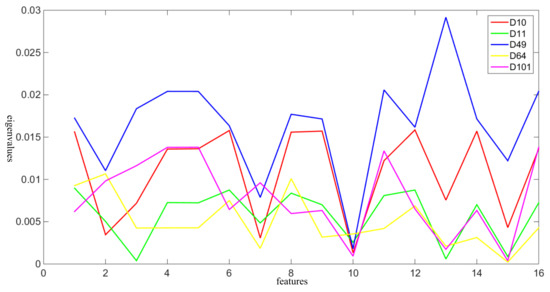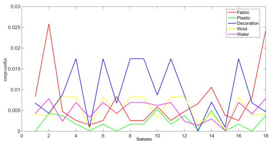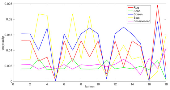 To evaluate the optimization ability of HALO and other evolutionary algorithms, it is necessary to choose a suitable objective function. Because the process of training can be considered prior knowledge, each texture feature is a category. The Fisher criterion has good performance in the calculation of heuristic knowledge. The Fisher criterion aims to maximize the inter-class difference and minimize the intra-class difference, and it is usually applied to assess binary classification problems [34]. For multi-classification problems, the objective function should be improved to synthetically weight the differences between each category. Therefore, it is defined as shown in Equation (11):