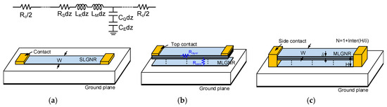 However, it is worth noting that the physical properties of monolayer GNR is susceptible to the substrate influence, which can be avoided for the case of multilayer GNR (MLGNR). Moreover, MLGNR has superior characteristics for signal propagation as the multilayer structure can effectively reduce the interconnect resistance [29,30,31,32]. Figure 2b,c show the schematic diagrams of MLGNR interconnects with top contacts and side contacts, respectively. In the figure, denotes the van der Waal’s gap between the adjacent graphene layers, is the thickness of the MLGNR interconnect, and the number of graphene layers , where “” represents that only the integer part is considered.