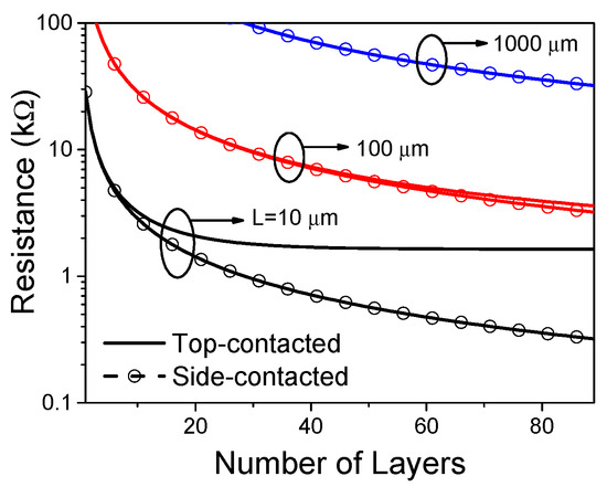 To date, most of the experiments on multilayer graphene have employed top contacts, as shown in Figure 2b [33,34,35]. For the top-contacted MLGNR interconnect, Kumar, et al. [36] developed a resistor circuit model with the consideration of in-plane resistance and perpendicular resistance between adjacent layers . It was found that the perpendicular resistance makes the conductance a nonlinear function of the number of graphene layers. Further, Pan, et al. [37] conducted a benchmark study, which indicated such top-contacted MLGNR can exhibit advantages under certain circumstances. With the increasing interconnect length, however, the in-plane resistance increases, while the perpendicular resistance decreases continually. It can be seen in Figure 3, that as the length exceeds a certain value, the influences of the contact type and interlayer coupling can be ignored, and the top-contacted MLGNR can be treated as a side-contacted one [28].