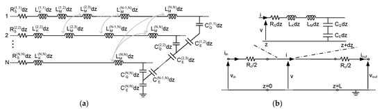 Figure 4 shows the multi-conductor transmission line model and the simplified equivalent single-conductor (ESC) transmission line model of a side-contacted MLGNR interconnect. In the multi-conductor model, the mutual capacitance and inductance between the adjacent graphene layers have been considered. The MLGNR interconnects are assumed to be decoupled, because several decoupled graphene layers have been grown experimentally in References [33,34], and demonstrated theoretically in Reference [39]. In this case, the resistance of the MLGNR interconnect is a parallel connection of the resistance of each layer, i.e., . The per-unit-length (p.u.l.) magnetic inductance and electrostatic capacitance are determined by the MLGNR geometry and its surrounding dielectrics. By applying the boundary conditions, the equivalent kinetic inductance and quantum capacitance in the ESC model can be obtained by recursive schemes [40,41]. As the kinetic inductance is much larger than the magnetic inductance, the equivalent kinetic inductance in the ESC model can be expressed as [28]:
