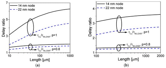 Time delay ratios of MLGNR interconnects and Cu wires at the (a) intermediate level and (b) global level [28].