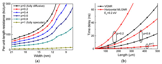 Figure 7a shows the p.u.l. resistance of a monolayer GNR interconnect with a 400 µm length and the 0.2 eV Fermi level. It is shown that the resistance of a monolayer GNR increases with the decreasing width. For GNRs with , the resistance increases superlinearly with the decreasing width when the width becomes smaller than 10 nm. This superlinear relationship between GNR resistance and width becomes more significant as decreases. Note that for on-chip interconnect applications, the aspect ratio is always larger than 1 [2]. Therefore, it can be concluded that VGNR, which has a larger GNR width, possesses smaller resistivity than horizontal MLGNR. Figure 7b shows the time delay of Cu, horizontal MLGNR, and VGNR interconnects at the intermediate level. It can be found that the decrease in specularity parameter can effectively improve the electrical performances of GNR interconnects. When , the horizontal MLGNR and VGNR show similar performances. As is well known, however, the perfectly specular edges are difficult to fabricate [47]. Therefore, in practical applications, for , the VGNR interconnect can provide smaller time delay than horizontal MLGNR interconnect. In other words, VGNR interconnect requires smaller specularity parameter than the horizontal MLGNR one, thereby reducing the process difficulty.