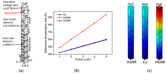 As described earlier, the graphene is an anisotropic material, and its out-plane thermal conductivity is much lower than the in-plane one. Here, the in-plane and out-plane thermal conductivities of graphene are assumed as 1750 W/m·K and 10 W/m·K, respectively [48]. Under such circumstance, the horizontal MLGNR would hinder heat dissipation in vertical direction, thereby threatening the IC performance and reliability. It has been found that VGNR interconnects are likely to solve this problem. Figure 8a depicts the unit cell for simulation performed in commercial software COMSOL Multiphysics, with the geometrical parameters adopted at the 7.5 nm technology node from ITRS projection [2]. In the simulation, an equivalent packaging layer is considered, and the bottom junction temperature and the top ambient temperature are assumed as 378 K and 318 K, respectively. By injecting power into the topmost global interconnect, the temperature rise as a function of input power can be depicted as shown in Figure 8b and the plots the temperature profiles could be obtained as shown in Figure 8c. It is evident that the heat dissipation problems, which is crucial for future nanoscale ICs development, can be effectively avoided by VGNR interconnects [49].