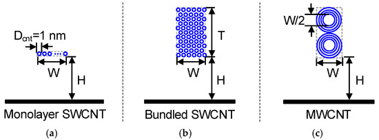 where . For an MWCNT interconnect, as shown in Figure 9c, it is usually assumed that the innermost shell diameter is half of the outermost shell diameter, and the aspect ratio is 2, i.e., two parallel MWCNTs are stacked. In general, an MWCNT possesses a longer MFP but smaller number of conducting channels than the bundled SWCNTs with the same cross-sectional dimensions. For MWCNT interconnects, Li, et al. [71] developed a multiconductor transmission line model, which was further simplified as an ESC transmission line model [40]. It was demonstrated that the ESC model can accurately predict the time delay and facilitate the simulation speed although it would result in an overestimation of peak crosstalk [72]. Based on the ESC model, Liang, et al. [73] characterized the performance of MWCNT interconnects by using the finite-difference time-domain (FDTD) method. Further, some studies have been conducted to analyze the crosstalk, variability, Joule heating, and electrostatic discharge (ESD) reliability of CNT interconnects [64,74,75,76,77,78,79,80,81,82,83].