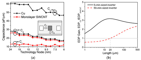 (a) Parasitic capacitances of Cu and monolayer SWCNT interconnects. (b) Energy-delay product ratio between Cu and monolayer SWCNT interconnects at the 19 nm technology node [60].