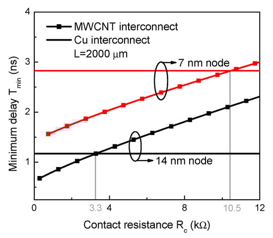 On the other hand, to reduce the interconnect delay, the repeater insertion is usually employed in the design of high-performance VLSI [42]. Previous studies have been carried out to investigate the optimal repeater insertion for CNT interconnects [75,84]. Unfortunately, these studies didn’t consider the impact of metal-CNT contact resistance, which would be added along with each inserted repeater and surely influence the time delay, as shown in Figure 11 [85]. To resolve this issue, an analytical expression of the optimal repeater number was derived based on the Elmore delay equation in [86]. Furthermore, the influence of inductance on the repeater design in an MWCNT interconnect was considered [87]. Using the multivariable curve fitting technique, the closed-form expressions of optimal repeater size and the optimal number of segments can be obtained. Definitely, the smaller contact resistance is, the better performance can be achieved. Here, the maximum tolerant contact resistance of MWCNT interconnect is defined, beyond which the total time delay of MWCNT interconnect would be larger than that of Cu counterpart. Figure 12 gives the minimum time delay of an MWCNT interconnect versus contact resistance. It is shown that the maximum tolerant contact resistance increases from 3.3 kΩ to 10.5 kΩ as the technology node scales from 14 nm to 7 nm. Considering the size effect, however, the contact resistance will be scaled up 4 times from 14 nm node to 7 nm node. In other words, more efforts should be put on reducing the contact resistance with the technology advanced.