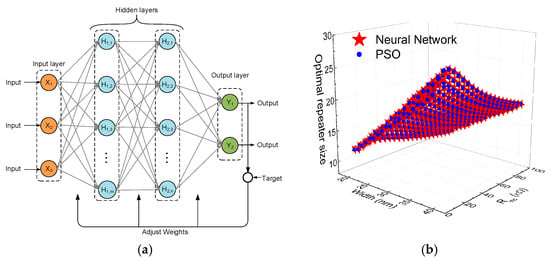 (a) Schematic of the back propagation neural network. (b) Optimal repeater size of MWCNT interconnects obtained using the PSO algorithm and trained neural network [90].