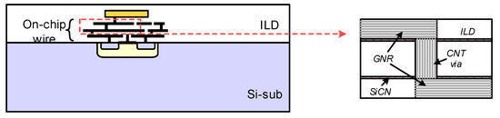 The ongoing miniaturization of the IC feature size has had a significant benefit in increasing the transistor speed. However, different from the transistor, the interconnect performance would be degraded due to the reduced conduction area and increased scattering probability for electrons [3,4]. Under such circumstances, the chip performance is restricted by the shrinking interconnect dimensions on account of both the interconnect delay and the power dissipation. Moreover, the interconnect reliability has been becoming a more and more important problem, as the ampacity of conventional Cu wire cannot satisfy the increasingly stringent requirements [2,5,6]. Therefore, interconnects have become the major challenge in the design of modern ICs, thereby leading to the transition of IC technology from transistor-centric to interconnect-centric [7]. To address the interconnect challenges for next-generation ICs, diverse improvements of interconnect optimization and design methods have been reported, such as a low-k dielectric structure, three-dimensional integration, and inter-chip optical interconnects [8,9,10].