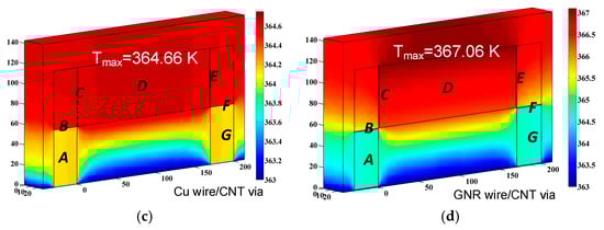 Using the finite-element method (FEM), the electrothermal characteristics of all-carbon 3-D interconnects have been studied in [95]. Figure 15a shows the simulation model, which is formed by one horizontal interconnect and two vertical vias. The 3-D interconnect structure is embedded into an interlayer dielectric, whose thermal conductivity is about 0.12 W/m·K. The bottom temperature is assumed as 363 K, and the other boundaries are set as adiabatic. The out-plane electrical conductivity of the MLGNR is 1 S/m. The geometrical parameters are adopted at the 22 nm technology node from the ITRS projection [2]. With a current of 0.4 mA injected, the temperature profiles are plotted in Figure 15b–d. In the simulation, a 1 nm-thick thin plate was used to capture the influences of contact resistance. Due to the impact of quantum contact resistance, all-carbon 3-D interconnect is more resistive than Cu counterpart, thereby increasing the temperature rise. On the contrary, the CNT vias help heat dissipation from hotspots to the bottom layer. Therefore, the maximum temperature is slightly increased with the implementation of all-carbon 3-D interconnects. The results also imply that CNT vias are more suitable to be placed near bottom layer.
