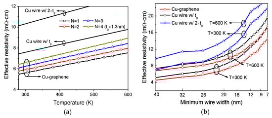 Figure 17a depicts the effective resistivity of Cu-graphene interconnects versus temperature. According to ITRS prediction, the barrier layer thickness would scale down to 1.3 nm at the 22 nm node [2]. However, such prediction is too optimistic and too challenging. Here, the barrier layer thicknesses of 1.3 nm and 2 × 1.3 nm are considered as references. It is evident that the effective resistivity can be reduced significantly by introducing graphene barrier layer, which is mainly due to the reduced Cu surface scattering [104]. Further, Figure 17b compares the effective resistivity of Cu wire and Cu-graphene interconnect at different technology nodes. The barrier layer thickness at each node is adopted from the ITRS projection [2]. It was found that the advantage of Cu-graphene interconnect over Cu wire becomes more significant with the IC feature size scaling down.