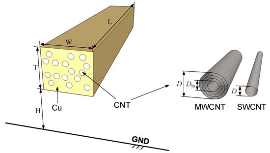 Figure 18 shows the schematic of a Cu-CNT composite interconnect over a ground plane. In the figure, identical CNTs are uniformly distributed inside the Cu wire. The CNTs can be SWCNTs or MWCNTs. Here, we define the CNT filling ratio as , where 0.31 nm is due to the separation between carbon and Cu atoms. The p.u.l. scattering resistance of the Cu-CNT composite interconnect can be calculated as , where [114,115]. The effective conductivity of CNTs is given by [116]