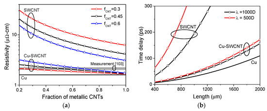 (a) Effective resistivity and (b) time delay of Cu, SWCNT, and Cu-SWCNT composite interconnect [114].