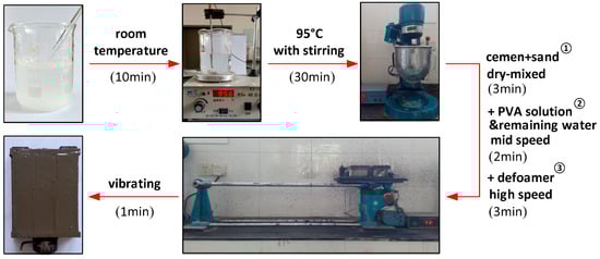 PVA powder was dispersed in cold water at room temperature for 10 min, and this mixture was heated to 95 °C with stirring to completely dissolve the PVA. Using a cement mortar mixer, cement and fine sand were first dry-mixed thoroughly for approximately three minutes. The prepared dispersed PVA solution and the remaining water were then poured into the cement mortar and mixed for two minutes with a mid speed stirring. The defoaming agent was then slowly added into the mix, and the mixing continued for three minutes with a high-speed stirring until the relatively homogeneous cement slurry was formed. The prepared mixture was poured into oiled molds and vibrated to remove air bubbles, then pouring the mixes into oiled molds (40 × 40 × 160 mm3). Afterwards, the specimens were removed from their molds after 24 h and cured in a moist room (relative humidity ≥97%) for 28 days. The detailed process of material preparation method is shown in Figure 2.