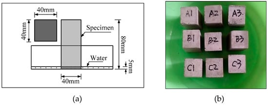 The capillary water absorption test on cement mortar was conducted after 28-day standard curing and determined according to DIN 52617 [26]. Fifteen samples of size 40 × 40 × 80 mm3 were adopted in this test, and the surface of samples was wax-sealed, and then the molded surface was immersed in water, the distance between the height of the water surface and the bottom edge of the test piece was 5 mm, the schematic diagram is shown in Figure 3. The results are the average values of three specimens.