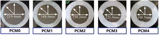 The flow table test was carried out on the freshly prepared mortars as described by GB/T2419-2005 [24]. The jumping table beats 25 times in 15 s and measures the average diameter of the fresh mortar on two mutually perpendicular sides.