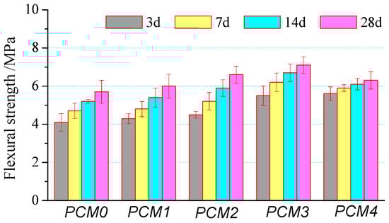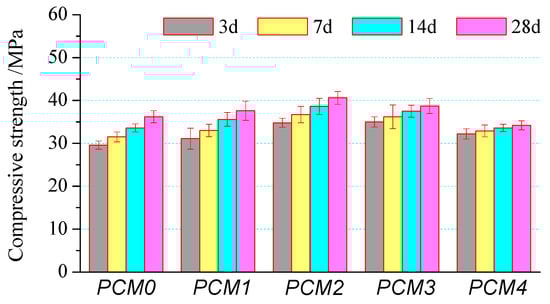 Figure 6 shows the compressive strength development of cement mortars with 0~2.0% PVA at the early age. Clearly, the growth trend of compressive strength of all mortars was quite similar to that of flexural strength, in which the strength increased at first and then decreased with the increase of PVA content. However, Figure 6 shows that the optimal use of PVA was 0.6% of cement content by mass, and the compressive strength increased by 12.15% as compared to PCM0 after 28 days of curing. Moreover, it is worth noting that the curing age impacted the improvement effect of PVA, and the reinforcement effect was more remarkable at the early curing age. For example, the three-day compressive strength of PCM2 was about 17.6% higher than that of PCM0, while its 14-day strength just increased by 14.9%, as compared to PCM0. Additionally, the excessive adding of PVA might reduce the compressive strength. As shown in Figure 6, the 28-day compressive strengths of PCM4 were about 5.5% lower than those of PCM0.
