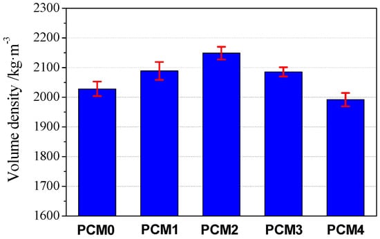 The mass per unit volume of a material that contains open and closed pores is referred to as the volume density, and the volume density can reflect the degree of internal compactness of materials. Figure 7 shows the effect of the PVA content on the volume density of the cement mortar. For the measured value, the volume density of the mortar increased with increasing PVA content until it reached an optimal amount of approximately 0.6 wt. %, and then started to decrease. This indicates that the incorporation of a proper amount of PVA can improve the internal pore structure of the mortar and improve the compactness of the mortar. The maximum density of 2148.8 kg/m3 corresponded to 0.6% PVA and compared with the mortar without PVA (2028.5 kg/m3), the increase in the density was determined to be 5.9%. When the PVA content continued to increase, it was difficult to uniformly mix the mortar during the stirring and shaking process due to its poor working performance, so the internal pores increased, and the volume density decreased. The minimum density of 1992.1 kg/m3 corresponded to 2.0% PVA content.
