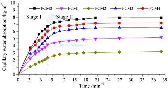 The water absorption of a material depends not only on its hydrophily but also on its porosity and pore size distribution. Figure 8 shows the capillary water absorption of cement mortars containing 0.2~2.0% PVA. The capillary water absorption rate is plotted on the ordinate, and the square root of time t0.5 is the abscissa. By analyzing the relationship between the capillary water absorption and the square root of the time, the pore characteristics of the mortar can be reflected. According to the test results in the figure, it can be found that the curve shape of water absorption of cement mortars with or without PVA was quite similar, and which can be divided into two stages: A rapid ascending phase (stage I), and a steady phase (stage II). At stage I, water diffuse along the micro-cracks or interconnecting holes and then fill the pores of surrounding mortar. Thus, the more micro-cracks and interconnecting holes, the faster this stage will ascend. Clearly, according to Figure 8, PCM0 had the highest micro-cracks or interconnecting holes, followed by PCM4, and PCM2 had the lowest micro-cracks and interconnecting holes as its ascending rate was the lowest. In stage II, the pores were filled by water to a certain level, the equilibrium between the rates of transporting moisture and filling pores is built. At this stage, the capillary water absorption value is related to the porosity, and a higher water absorption value means a higher porosity. The effect of PVA on the water absorption of mortar may be because (1) PVA reduces the hydrophily, and (2) PVA film fills the pores of the cement matrix. For this reason, the samples containing PVA had a much lower absorption over the control one. Especially for PCM2, the capillary water absorption of cement mortar was the lowest value of 3.21 kg/m2, which was 60% lower than that of PCM0. However, it should be noted that the addition of PVA will reduce the flow properties of cement mortar, as shown in Figure 4, the higher the PVA content, the lower the slump value was. Particularly for PCM4, the slump value reduced by about 50% as compared to PCM0. The poor flow behavior might cause the uneven dispersion of cement mortar, consequently, the interconnecting holes probably increased with the increase of PVA.