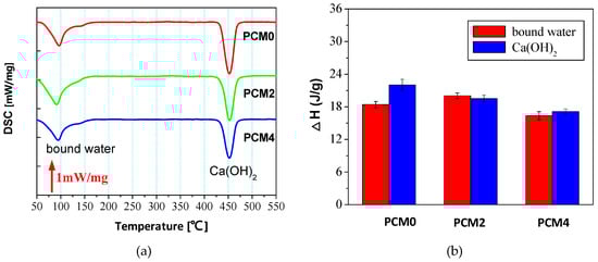 Differential scanning calorimetry (DSC) analysis of cement mortars at 28 days. (a) DSC curves and (b) bound water and Ca(OH)2 content.